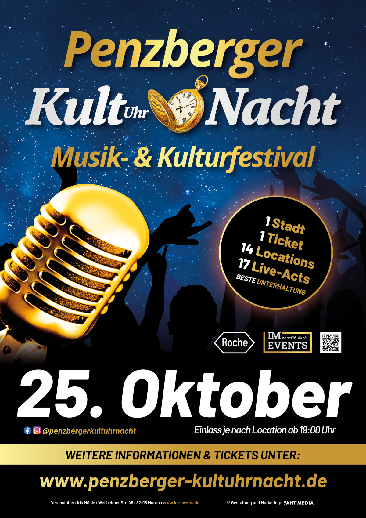 Die Penzberger KultUHRnacht ist ein jährliches Musik- und Kulturfestival, das die Stadt Penzberg zur Nacht der Zeitumstellung in eine lebendige Bühne verwandelt. Mit einem einzigen Ticket erhalten Besucher Zugang zu zahlreichen Veranstaltungsorten, die eine Vielzahl von Live-Acts und kulturellen Darbietungen bieten.